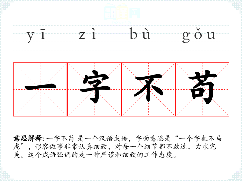 一字不苟 是一个汉语成语,字面意思是“一个字也不马虎”,形容做事非常认真细致,对每一个细节都不放过,力求完美。这个成语强调的是一种严谨和细致的工作态度。
