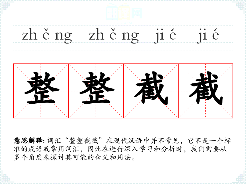词汇“整整截截”在现代汉语中并不常见,它不是一个标准的成语或常用词汇,因此在进行深入学习和分析时,我们需要从多个角度来探讨其可能的含义和用法。
