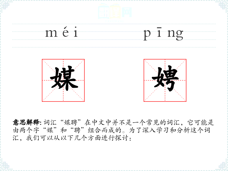 - “媒”字源于古代的婚姻介绍人,而“聘”字则源于古代的聘礼制度。