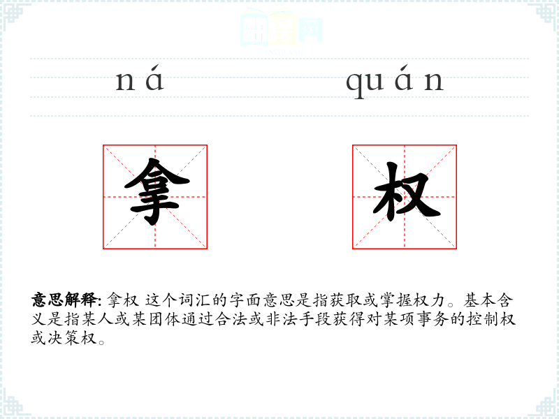 拿权 这个词汇的字面意思是指获取或掌握权力。基本含义是指某人或某团体通过合法或非法手段获得对某项事务的控制权或决策权。