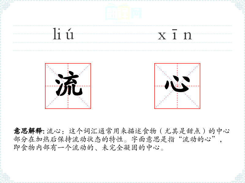 流心:这个词汇通常用来描述食物(尤其是甜点)的中心部分在加热后保持流动状态的特性。字面意思是指“流动的心”,即食物内部有一个流动的、未完全凝固的中心。