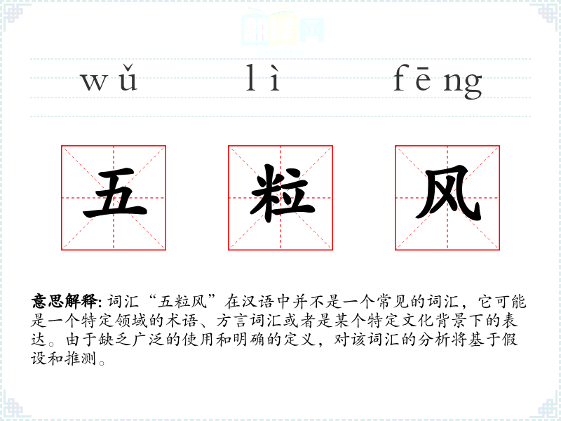词汇“五粒风”在汉语中并不是一个常见的词汇,它可能是一个特定领域的术语、方言词汇或者是某个特定文化背景下的表达。由于缺乏广泛的使用和明确的定义,对该词汇的分析将基于假设和推测。