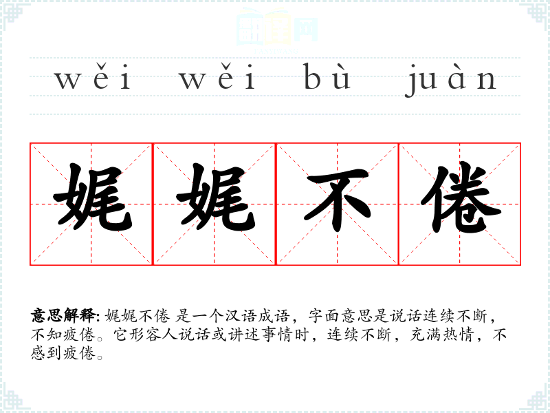 娓娓不倦 是一个汉语成语,字面意思是说话连续不断,不知疲倦。它形容人说话或讲述事情时,连续不断,充满热情,不感到疲倦。