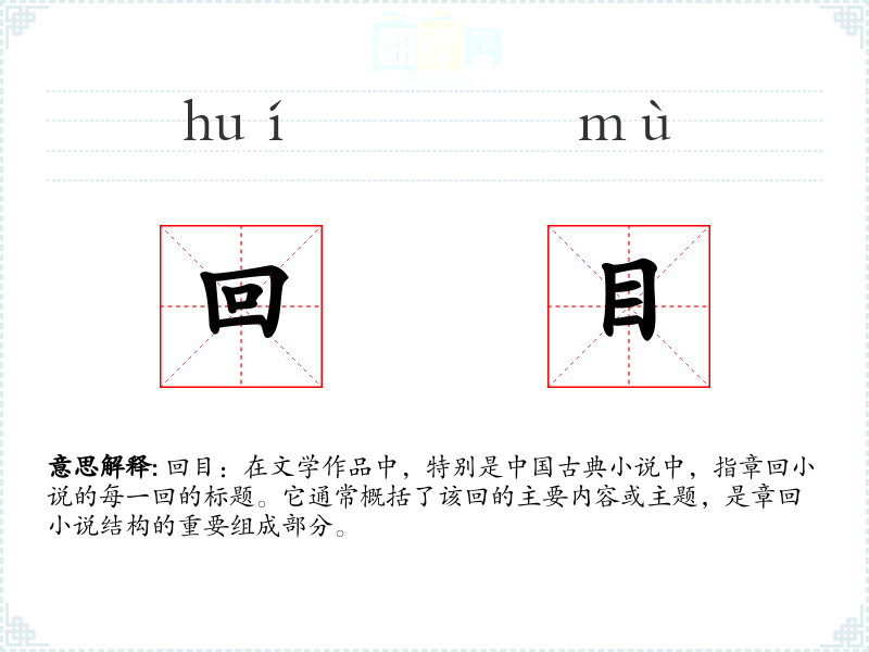 专业领域:在文学研究或古典文学教学中,“回目”是一个专业术语,用于分析和讨论章回小说的结构和内容。