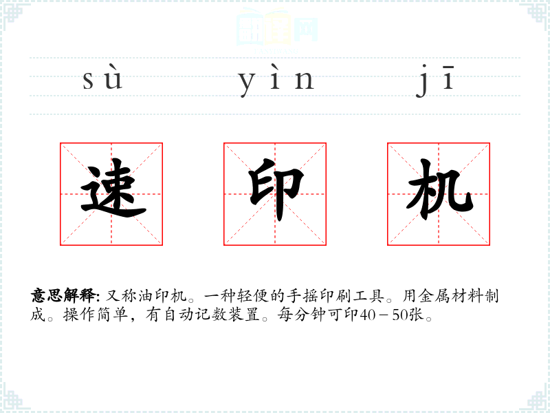 又称油印机。一种轻便的手摇印刷工具。用金属材料制成。操作简单,有自动记数装置。每分钟可印40-50张。