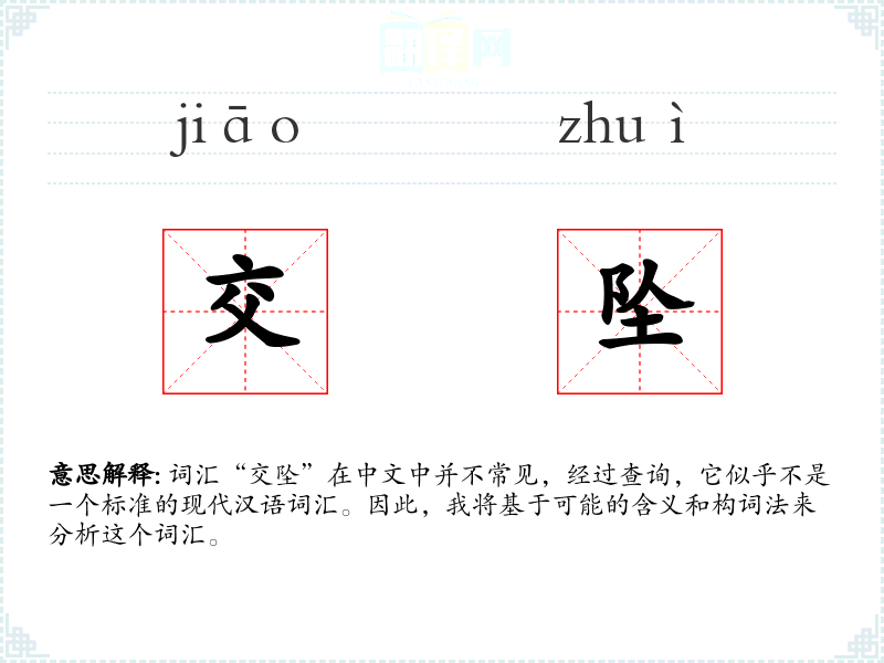 词汇“交坠”在中文中并不常见,经过查询,它似乎不是一个标准的现代汉语词汇。因此,我将基于可能的含义和构词法来分析这个词汇。
