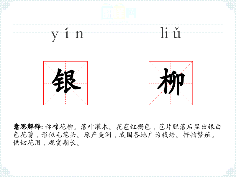 称棉花柳。落叶灌木。花苞红褐色﹐苞片脱落后显出银白色花蕾﹐形似毛笔头。原产美洲﹐我国各地广为栽培。扦插繁殖。供切花用﹐观赏期长。