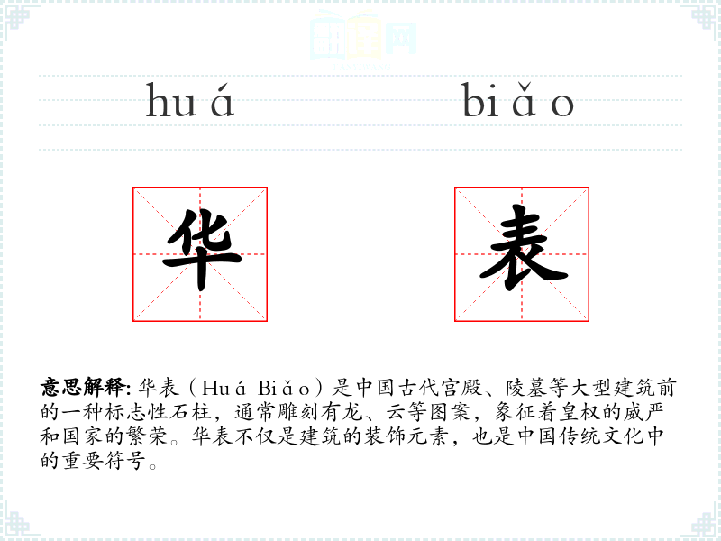 "华表"的意思解释、华表是什么意思由翻译网汉语词典查词提供。