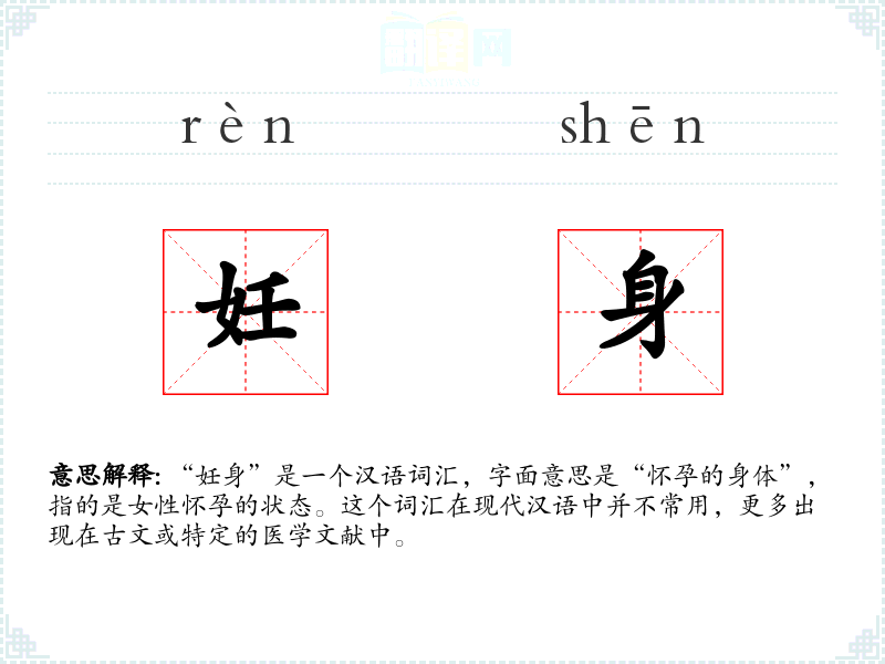 “妊身”是一个汉语词汇,字面意思是“怀孕的身体”,指的是女性怀孕的状态。这个词汇在现代汉语中并不常用,更多出现在古文或特定的医学文献中。