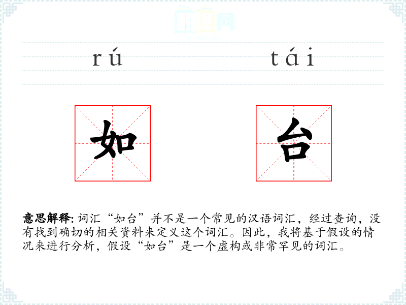 词汇“如台”并不是一个常见的汉语词汇,经过查询,没有找到确切的相关资料来定义这个词汇。因此,我将基于假设的情况来进行分析,假设“如台”是一个虚构或非常罕见的词汇。