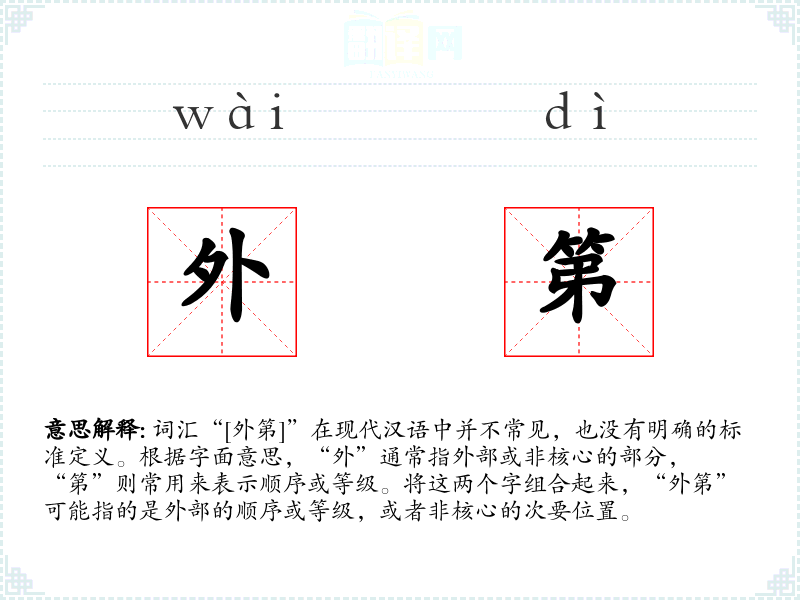 词汇“[外第]”在现代汉语中并不常见,也没有明确的标准定义。根据字面意思,“外”通常指外部或非核心的部分,“第”则常用来表示顺序或等级。将这两个字组合起来,“外第”可能指的是外部的顺序或等级,或者非核心的次要位置。