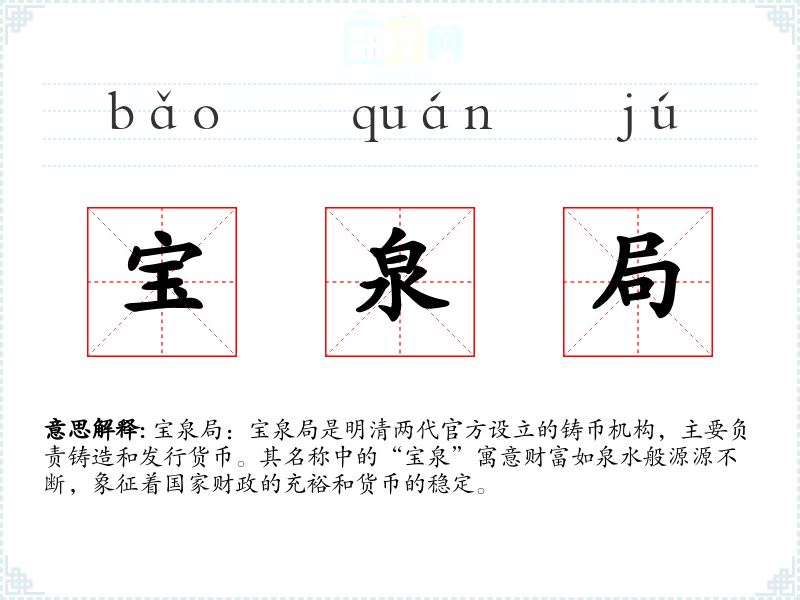 宝泉局:宝泉局是明清两代官方设立的铸币机构,主要负责铸造和发行货币。其名称中的“宝泉”寓意财富如泉水般源源不断,象征着国家财政的充裕和货币的稳定。