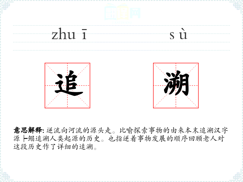 逆流向河流的源头走。比喻探索事物的由来本末追溯汉字源┝鳎追溯人类起源的历史。也指逆着事物发展的顺序回顾老人对这段历史作了详细的追溯。