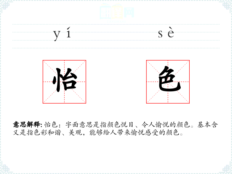 怡色:字面意思是指颜色悦目、令人愉悦的颜色。基本含义是指色彩和谐、美观,能够给人带来愉悦感受的颜色。
