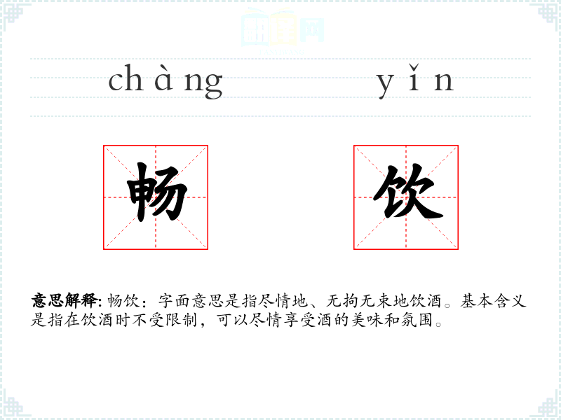 畅饮:字面意思是指尽情地、无拘无束地饮酒。基本含义是指在饮酒时不受限制,可以尽情享受酒的美味和氛围。