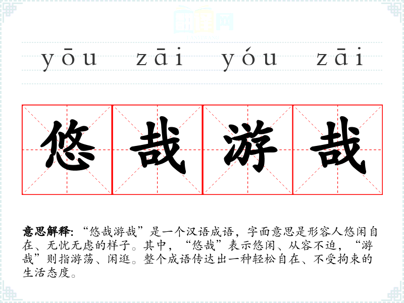 “悠哉游哉”是一个汉语成语,字面意思是形容人悠闲自在、无忧无虑的样子。其中,“悠哉”表示悠闲、从容不迫,“游哉”则指游荡、闲逛。整个成语传达出一种轻松自在、不受拘束的生活态度。