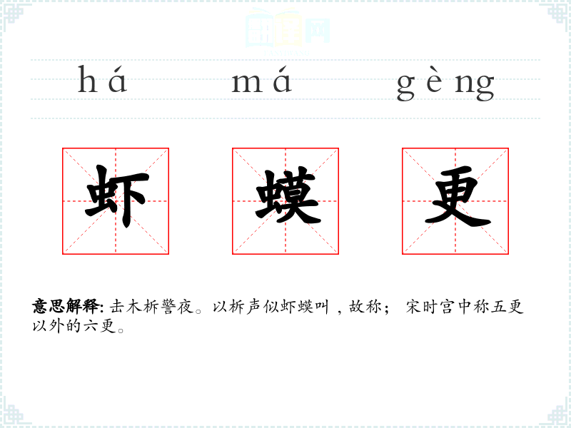 击木柝警夜。以柝声似虾蟆叫﹐故称; 宋时宫中称五更以外的六更。