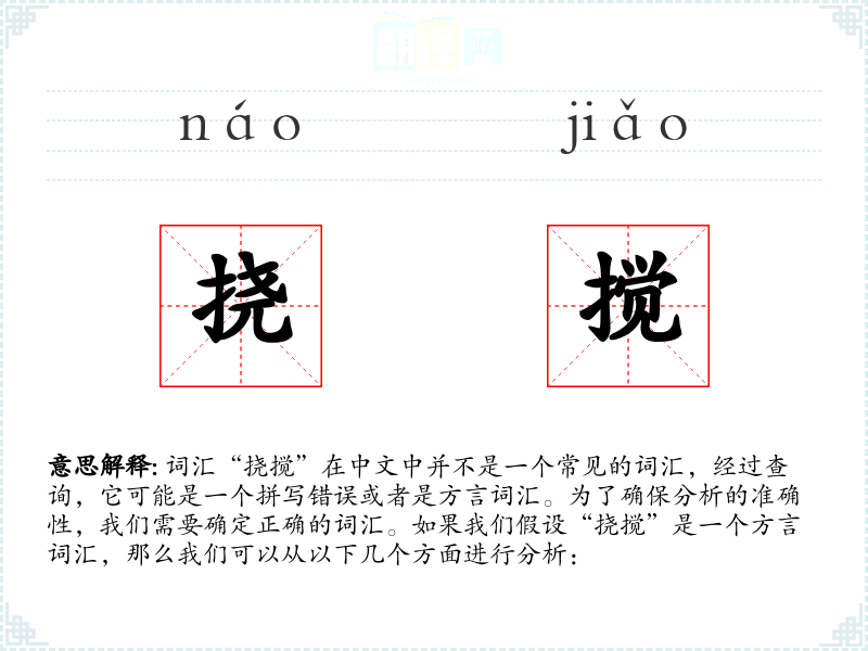 词汇“挠搅”在中文中并不是一个常见的词汇,经过查询,它可能是一个拼写错误或者是方言词汇。为了确保分析的准确性,我们需要确定正确的词汇。如果我们假设“挠搅”是一个方言词汇,那么我们可以从以下几个方面进行分析: