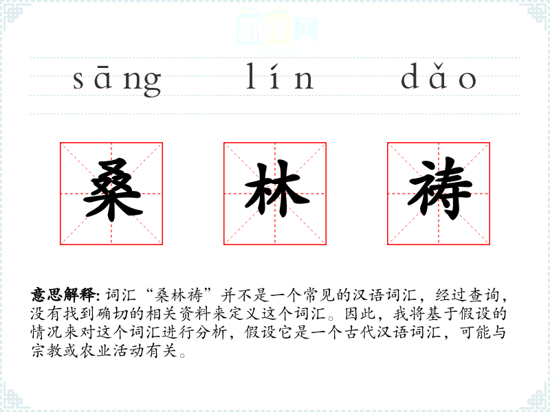 词汇“桑林祷”并不是一个常见的汉语词汇,经过查询,没有找到确切的相关资料来定义这个词汇。因此,我将基于假设的情况来对这个词汇进行分析,假设它是一个古代汉语词汇,可能与**或农业活动有关。