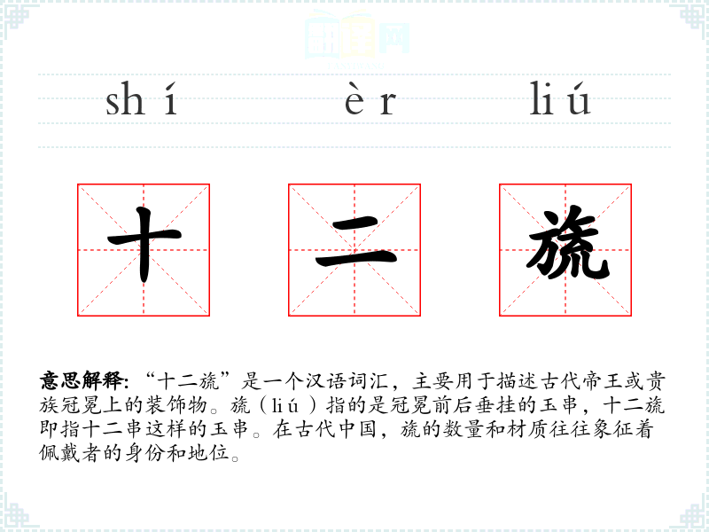 在文学作品中,“十二旒”常被用来描绘帝王或贵族的威严和尊贵。在口语中,这个词汇可能不太常用,但在历史、考古或古代服饰研究的专业领域中,它是一个重要的术语。