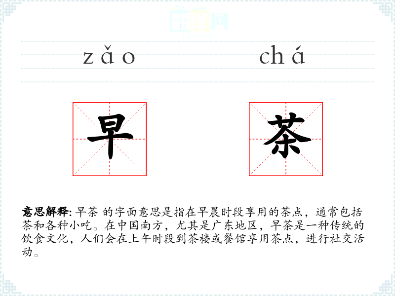 - 口语:在日常口语中,早茶是一个常用词汇,特别是在广东话中,人们会用“饮茶”来指代早茶。