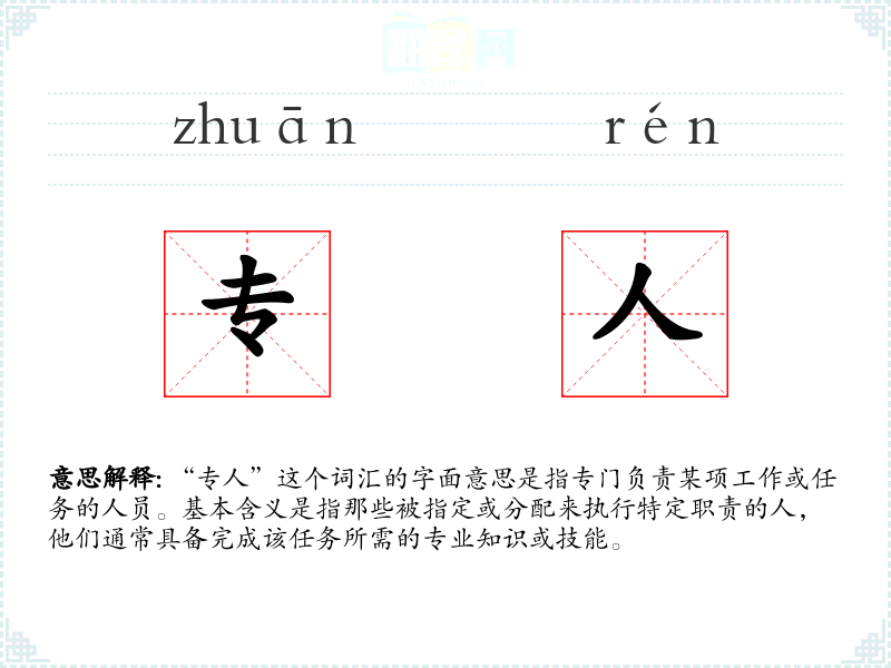 “专人”这个词汇的字面意思是指专门负责某项工作或任务的人员。基本含义是指那些被指定或分配来执行特定职责的人,他们通常具备完成该任务所需的专业知识或技能。