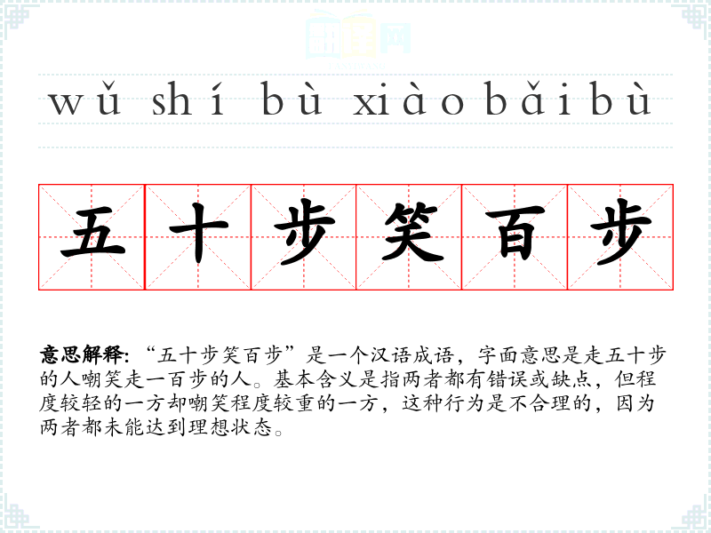 “五十步笑百步”是一个汉语成语,字面意思是走五十步的人嘲笑走一百步的人。基本含义是指两者都有错误或缺点,但程度较轻的一方却嘲笑程度较重的一方,这种行为是不合理的,因为两者都未能达到理想状态。