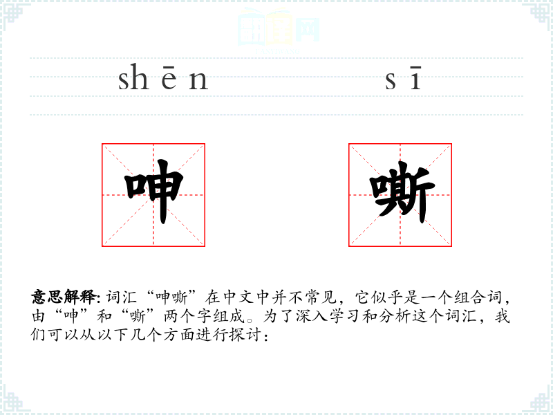 词汇“呻嘶”在中文中并不常见,它似乎是一个组合词,由“呻”和“嘶”两个字组成。为了深入学习和分析这个词汇,我们可以从以下几个方面进行探讨: