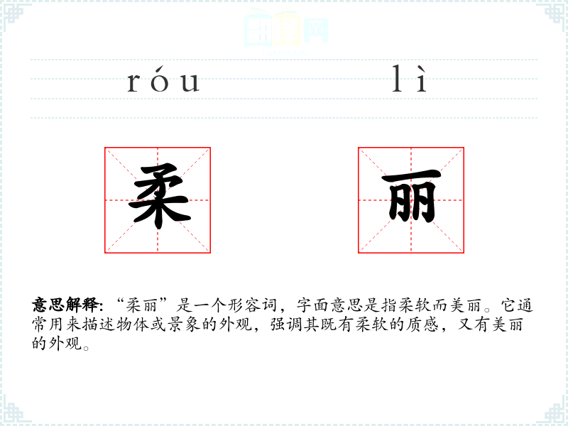 “柔丽”是一个形容词,字面意思是指柔软而美丽。它通常用来描述物体或景象的外观,强调其既有柔软的质感,又有美丽的外观。