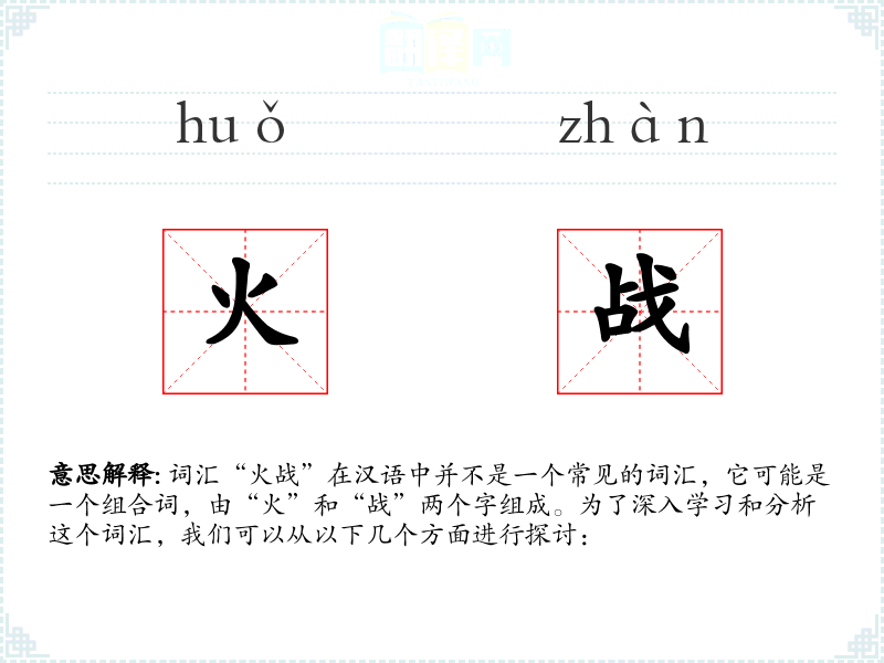 词汇“火战”在汉语中并不是一个常见的词汇,它可能是一个组合词,由“火”和“战”两个字组成。为了深入学习和分析这个词汇,我们可以从以下几个方面进行探讨: