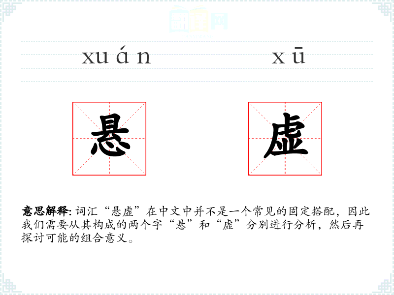 词汇“悬虚”在中文中并不是一个常见的固定搭配,因此我们需要从其构成的两个字“悬”和“虚”分别进行分析,然后再探讨可能的组合意义。