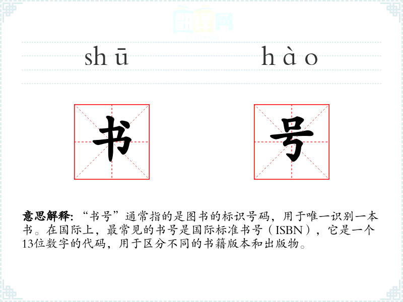 - 反义词:无(书号是一个特定的标识,没有直接的反义词)