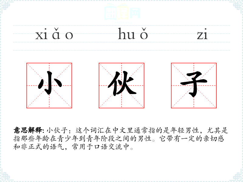 小伙子:这个词汇在中文里通常指的是年轻男性,尤其是指那些年龄在青少年到青年阶段之间的男性。它带有一定的亲切感和非正式的语气,常用于口语交流中。