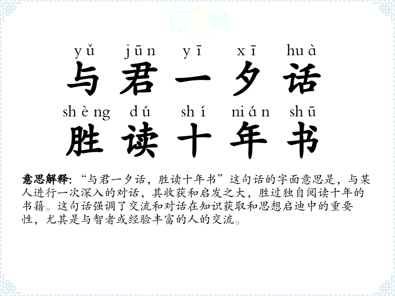 “与君一夕话,胜读十年书”这句话的字面意思是,与某人进行一次深入的对话,其收获和启发之大,胜过独自阅读十年的书籍。这句话强调了交流和对话在知识获取和思想启迪中的重要性,尤其是与智者或经验丰富的人的交流。