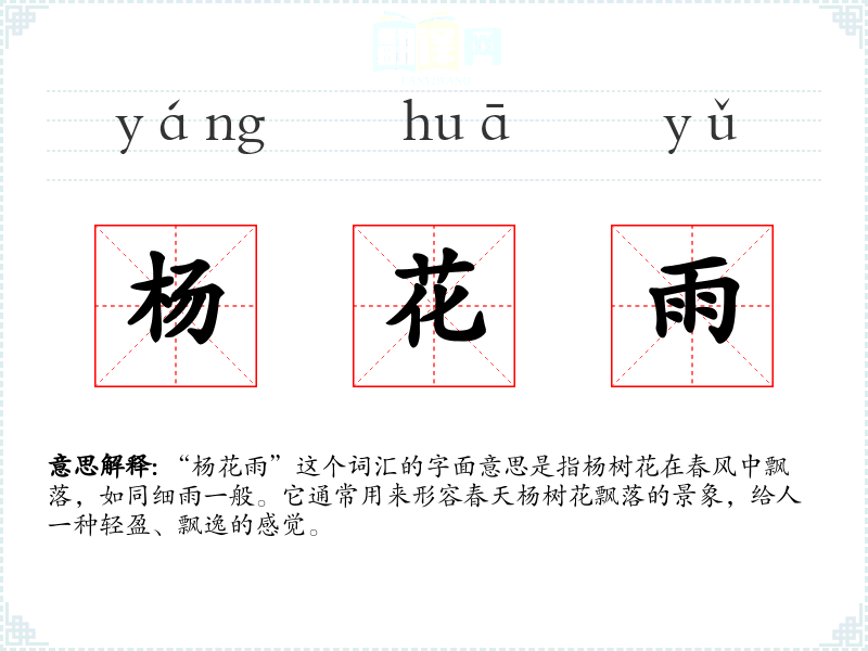 “杨花雨”这个词汇的字面意思是指杨树花在春风中飘落,如同细雨一般。它通常用来形容春天杨树花飘落的景象,给人一种轻盈、飘逸的感觉。