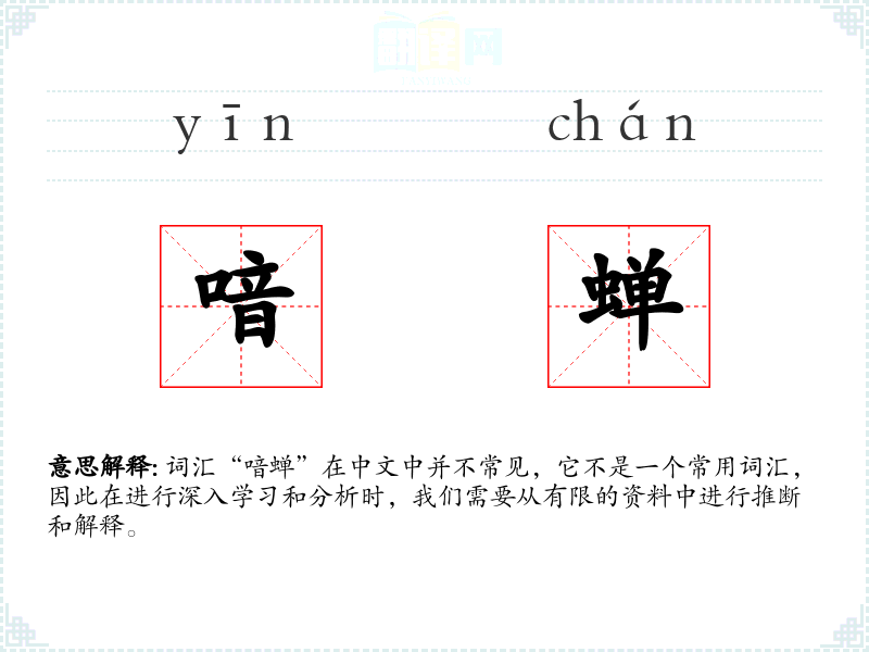 词汇“喑蝉”在中文中并不常见,它不是一个常用词汇,因此在进行深入学*和分析时,我们需要从有限的资料中进行推断和解释。