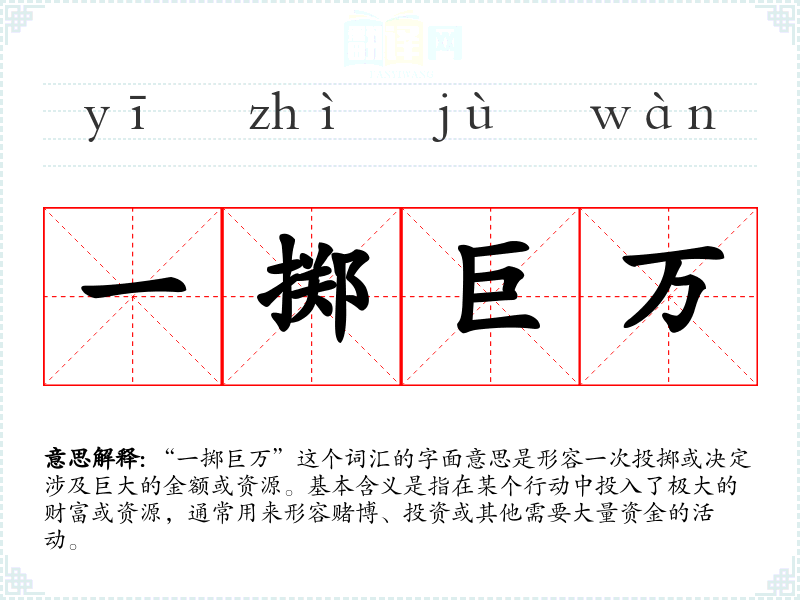 “一掷巨万”这个词汇的字面意思是形容一次投掷或决定涉及巨大的金额或资源。基本含义是指在某个行动中投入了极大的财富或资源,通常用来形容赌博、投资或其他需要大量资金的活动。