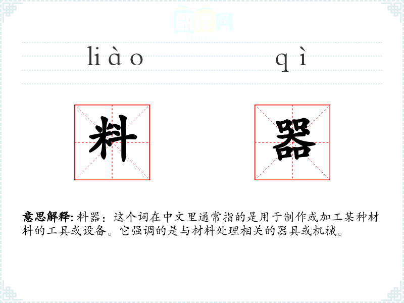 在英语中,类似的词汇可能是“tool”或“equipment”,但这些词更通用,不像“料器”那样特指与材料处理相关的工具。