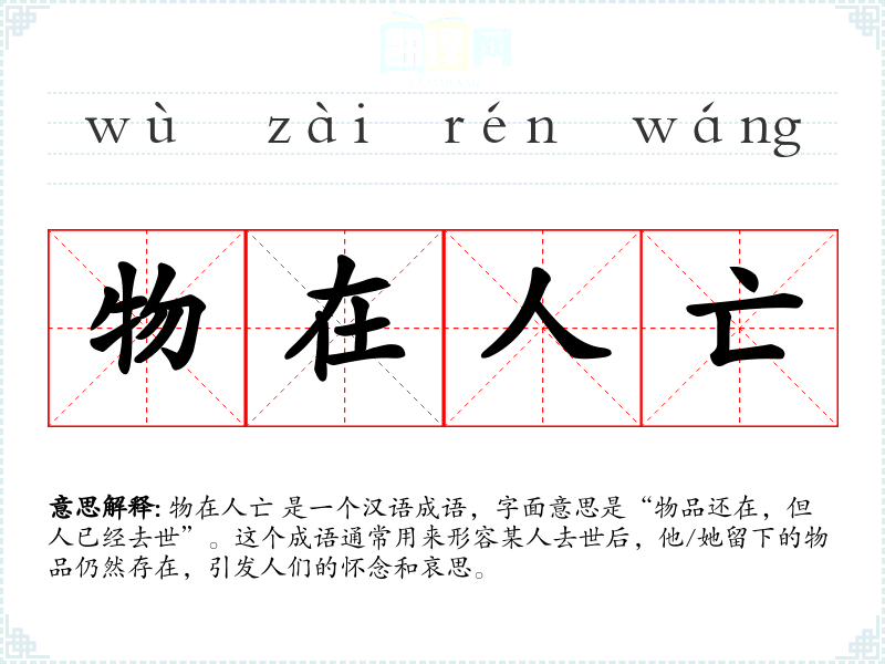 物在人亡 是一个汉语成语,字面意思是“物品还在,但人已经去世”。这个成语通常用来形容某人去世后,他/她留下的物品仍然存在,引发人们的怀念和哀思。
