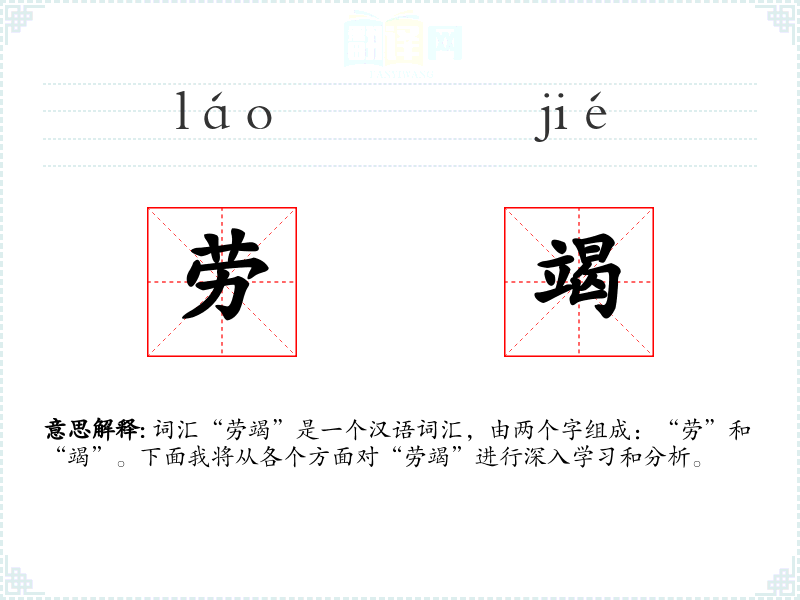 “劳”字古已有之,意为劳动、劳作;“竭”字意为尽、完。两个字组合在一起,形成了“劳竭”这个词汇,用来形容因劳动过度而导致的疲惫状态。