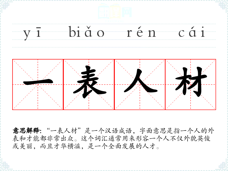 “一表人材”是一个汉语成语,字面意思是指一个人的外表和才能都非常出众。这个词汇通常用来形容一个人不仅外貌英俊或美丽,而且才华横溢,是一个全面发展的人才。