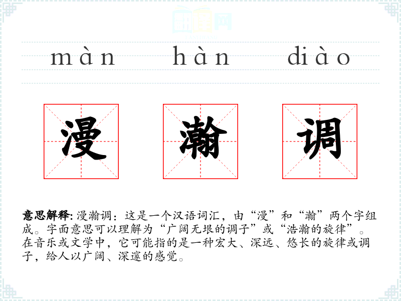 “漫瀚调”这个词可能是现代汉语中的一个新造词,结合了“漫”(广阔)和“瀚”(浩瀚)两个字,用来形容某种音乐或文学作品中的宏大、深远的调子或旋律。在古代文献中,可能没有直接对应的词汇,但其含义可以通过其他词汇组合来表达。