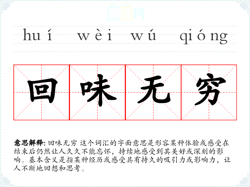 回味无穷 这个词汇的字面意思是形容某种体验或感受在结束后仍然让人久久不能忘怀,持续地感受到其美好或深刻的影响。基本含义是指某种经历或感受具有持久的吸引力或影响力,让人不断地回想和思考。