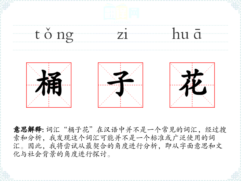 词汇“桶子花”在汉语中并不是一个常见的词汇,经过搜索和分析,我发现这个词汇可能并不是一个标准或广泛使用的词汇。因此,我将尝试从最契合的角度进行分析,即从字面意思和文化与社会背景的角度进行探讨。