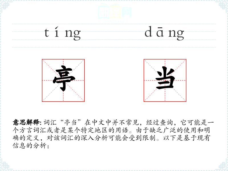 综上所述,词汇“亭当”的分析受到其含义不明确的限制,可能需要更多的语言学研究或方言调查来进一步了解其含义和使用情况。