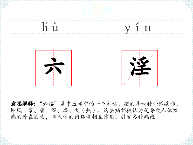“六淫”是中医学中的一个术语,指的是六种外感病邪,即风、寒、暑、湿、燥、火(热)。这些病邪被认为是导致人体疾病的外在因素,与人体的内环境相互作用,引发各种病症。