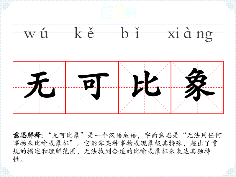 “无可比象”是一个汉语成语,字面意思是“无法用任何事物来比喻或象征”。它形容某种事物或现象极其特殊,超出了常规的描述和理解范围,无法找到合适的比喻或象征来表达其独特性。