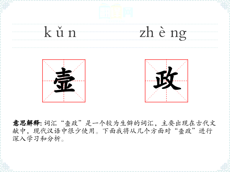 词汇“壸政”是一个较为生僻的词汇,主要出现在古代文献中,现代汉语中很少使用。下面我将从几个方面对“壸政”进行深入学*和分析。