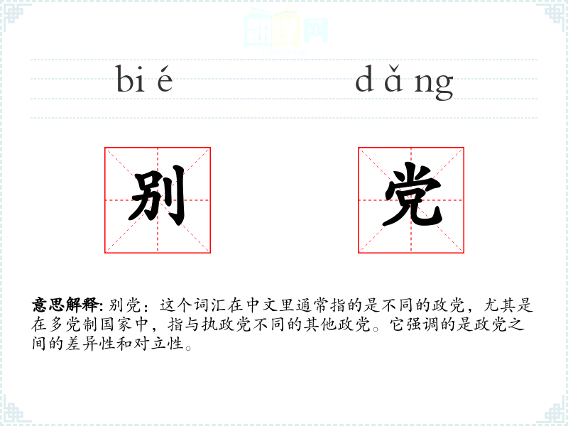 “别党”这个词汇直接来源于中文,字面意思是“不同的政党”。在政治体制的演变中,随着多党制的普及,这个词汇的使用频率逐渐增加。