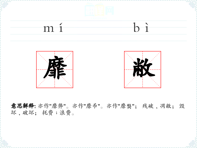 亦作"靡弊"。亦作"靡币"。亦作"靡獘"; 残破﹐凋敝; 毁坏﹐破坏; 耗费﹔浪费。